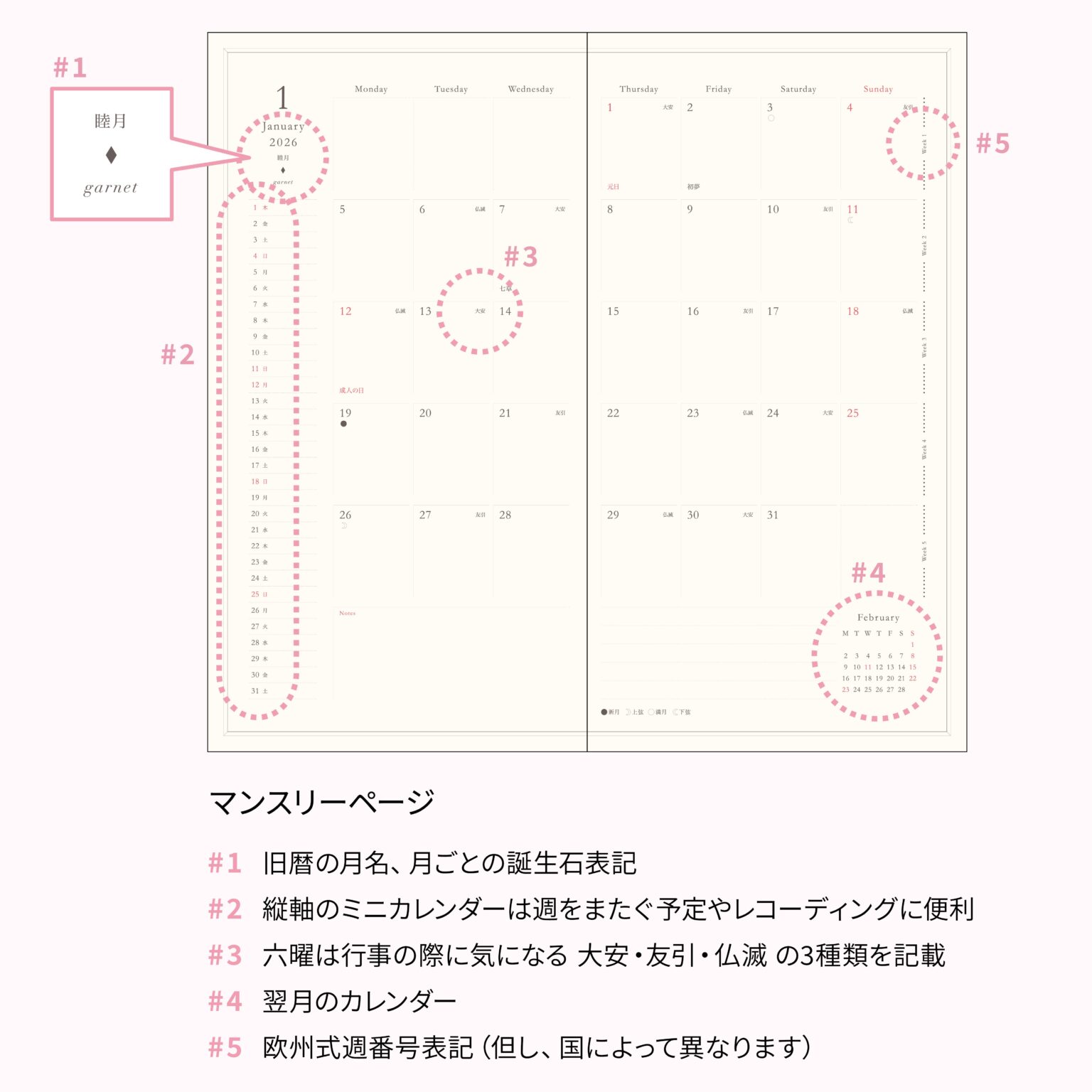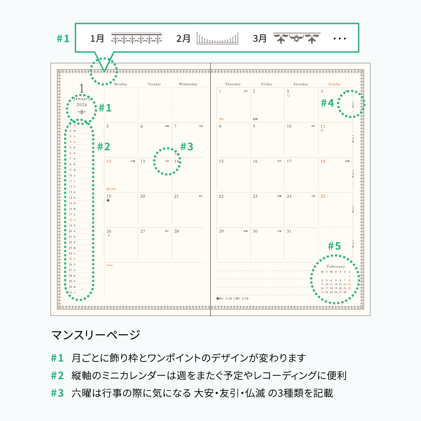 レインボー箔押しがインパクト大!の「ウマカナ」、 鳥と可憐な花をちりばめた「フィオーリ」、シマエナガの愛らしい姿をえがいた「スノーフェアリー」がマンスリー・フルカラーで登場です。 ※ WEB通販と一部取り扱い店でのみ販売の限定ダイアリーです。