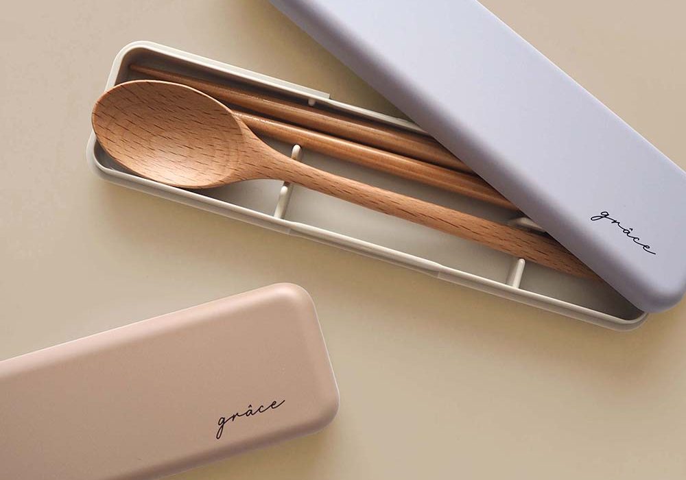 grâce(グラース)はフランス語で「優雅さ、優美」という意味。ランチタイムをちょっと特別な時間に、そしてちょっぴり優雅な気持ちで過ごせるようにとの想いから生まれたランチシリーズです。天然木のお箸とスプーンのセットは、蓋が外れるので洗いやすく、いつも清潔に持ち歩けます。