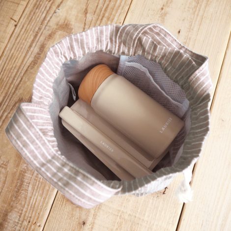 お弁当を入れるのに最適なサイズの巾着袋。ナチュラルな生地感と色合いがかわいらしい新色が追加になります。内側には保冷・保温効果を補助するアルミ生地を使用しているので、保冷剤を併用すると保冷効果が持続しやすく、またお弁当の温かさで保温効果が保たれます。
