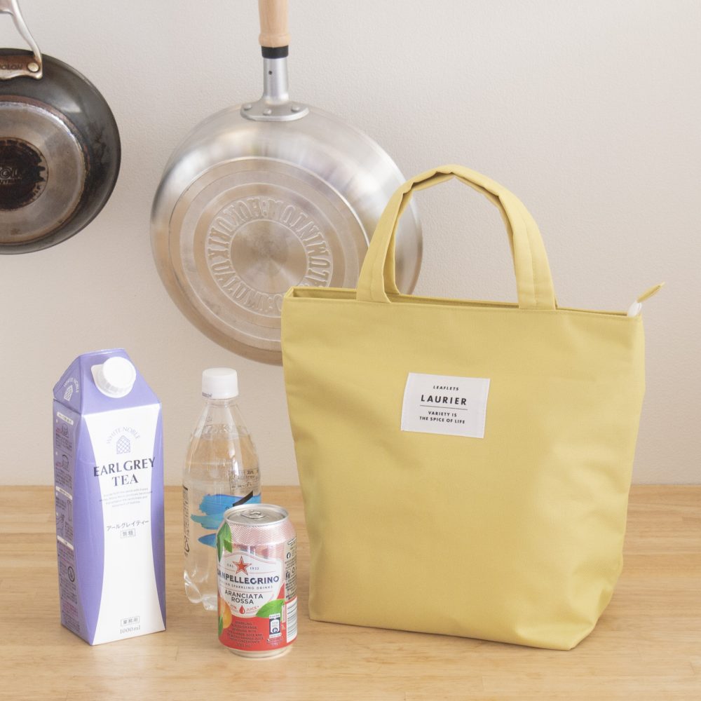 大きめサイズの保冷ランチトート。1人分のお弁当では物足りないときにパンやお弁当を追加して入れても余裕です。900mlのペットボトルや牛乳などのパック飲料を立てたままで入れられるので、少量のお買い物にも便利。