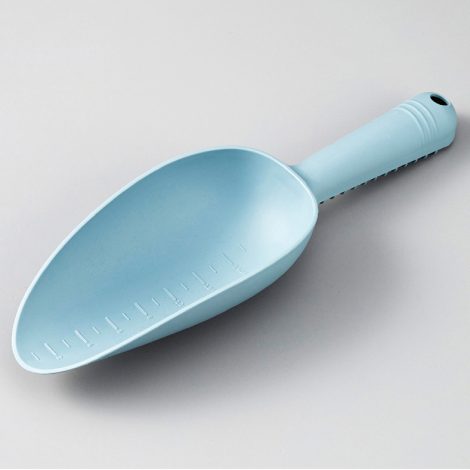 プラスチック素材のスコップ。掘るだけでなく鉢に土を入れる時にも使いやすい、深めの作りです。