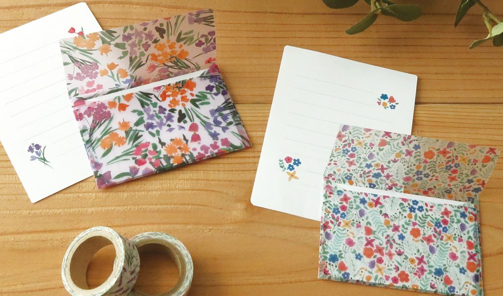 花柄の透け感がきれいなクレール ミニレターセットに、第2弾の柄が登場です。プレゼントに添えたり、ちょこっと気持ちを伝えたいときに便利。封筒の柄を邪魔しない、透明の丸い封かんシール付き。