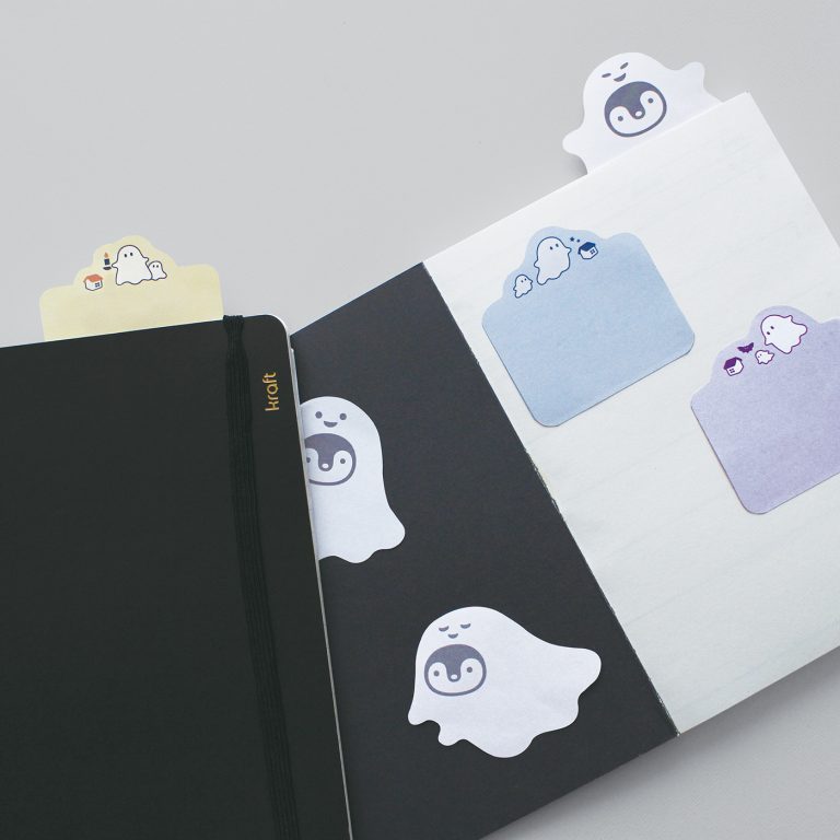 おばけの形をしたダイカットのふせん。下部が糊部分になっているので、おばけの顔が出るように本に貼ったり、メッセージに添えるとインパクト大◎