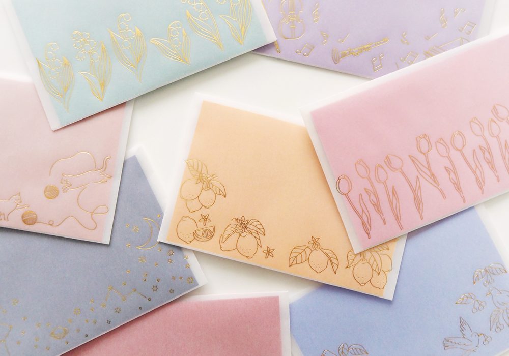 トレーシングペーパーの封筒に線画の絵柄を金色の箔で押したレターセットです。便箋を封筒に入れると紙の色が透けて、まるでお菓子の包み紙のような可愛さがあります。