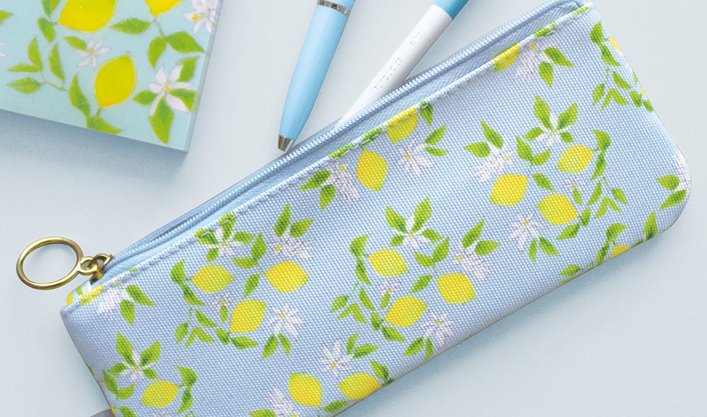 鮮やかな花柄が映えるコンパクトなペンケース。綿素材の風合いが感じられる生地で、シャリ感のある手触りが特徴です。スリムな形状ですが、ペンが10本程度入ります。ゴールドの引き手はリング形になっていて開閉しやすく、デザインのアクセントにもなっています。