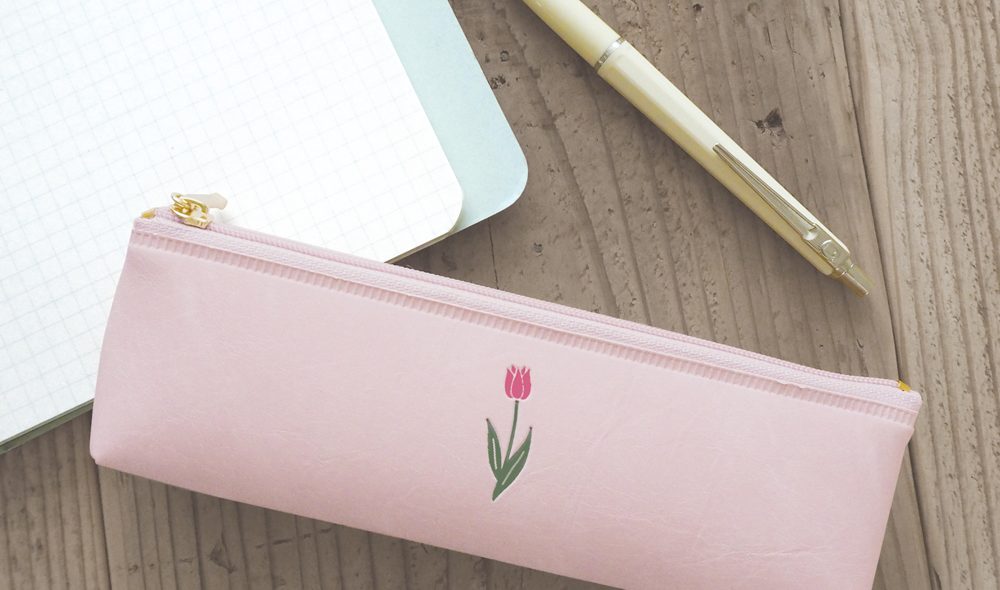 人気のお花を両面に2色の箔押しであしらった、スリムタイプのペンケース。それぞれ前面は開花、背面はつぼみをモチーフにしています。1色のペンなら10本くらい入る、細めのマチありサイズです。
